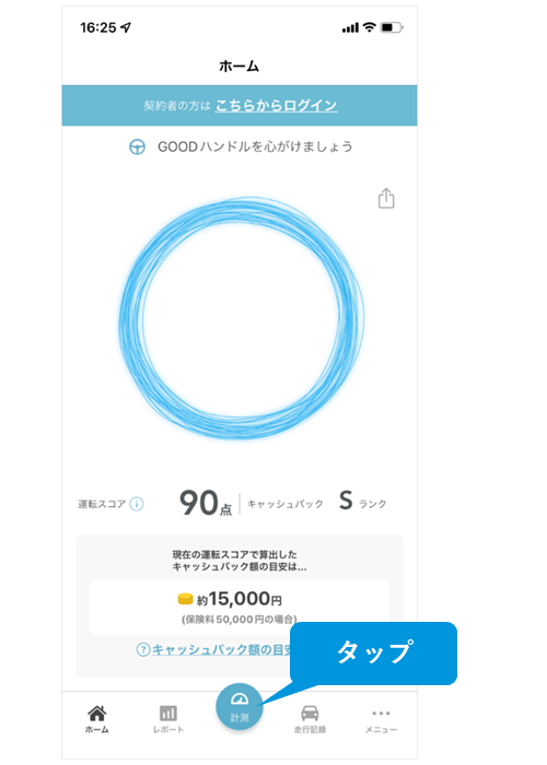 申込前に運転計測をお試しになりたい方は、アプリストアから「GOOD DRIVE アプリ」をインストールしていただき、「計測」を押して、運転計測機能をご利用ください。